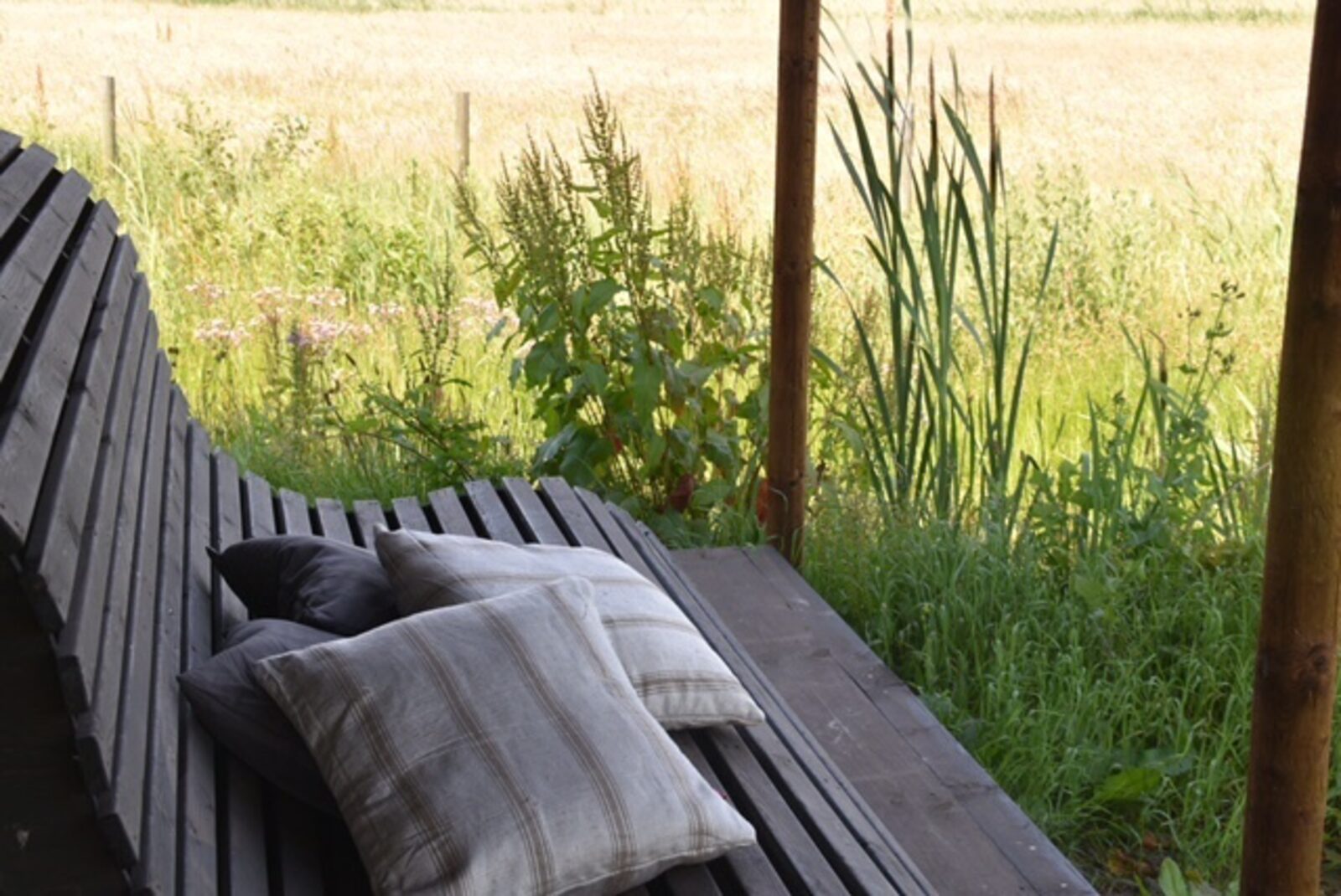 Leefruimte met eettafel en houten bank met kussens.
