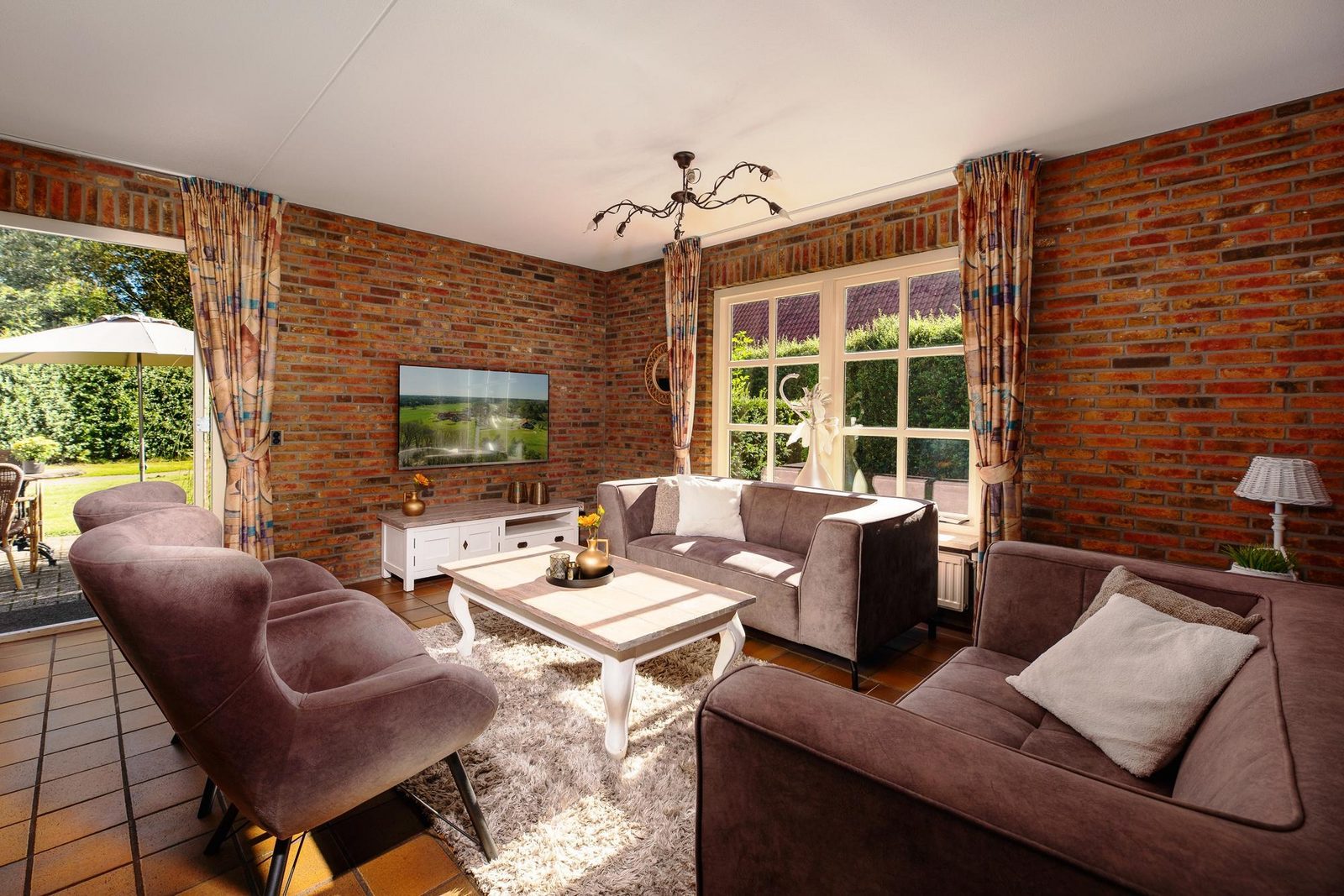 Woonkamer met zitgedeelte en tv, eettafel en openslaande deuren naar het terras.